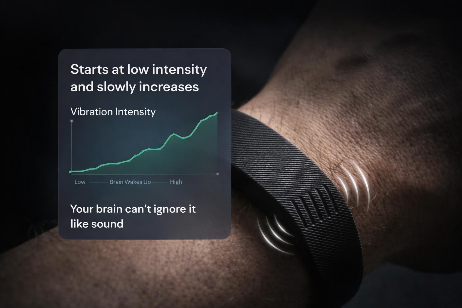 Starts at low intensity and slowly increases. You brain cant ignore it like sound
